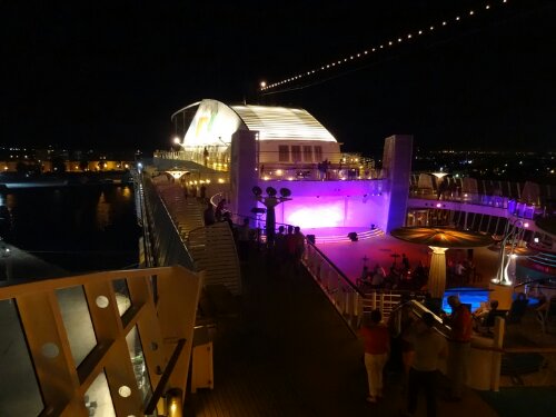 Vor dem Auslaufen gab es noch die obligatorische Seenotrettungsübung. Oder mit anderen Worten: 35 Minuten mit angezogener Weste unter dem Rettungsboot Y warten, schwitzen, warten, schwitzen, warten…. bis auch die letzten 4 Kabinen von Deck 8 geschnallt haben, dass die Übung obligatorisch ist. Kollektivstrafe wie im Militär 😉