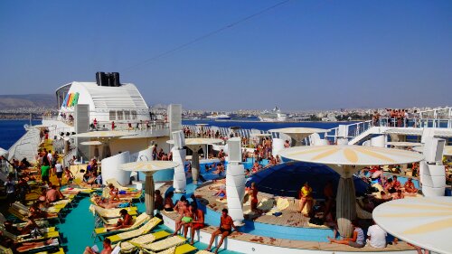 Um vier hiess es wieder Abschied nehmen von Athen, nächste Station ist Rhodos. Die meisten Passagiere waren schon wieder mit dem Liegestuhlspiel beschäftigt, während im Hintergrund die Stadt Athen zu sehen ist: