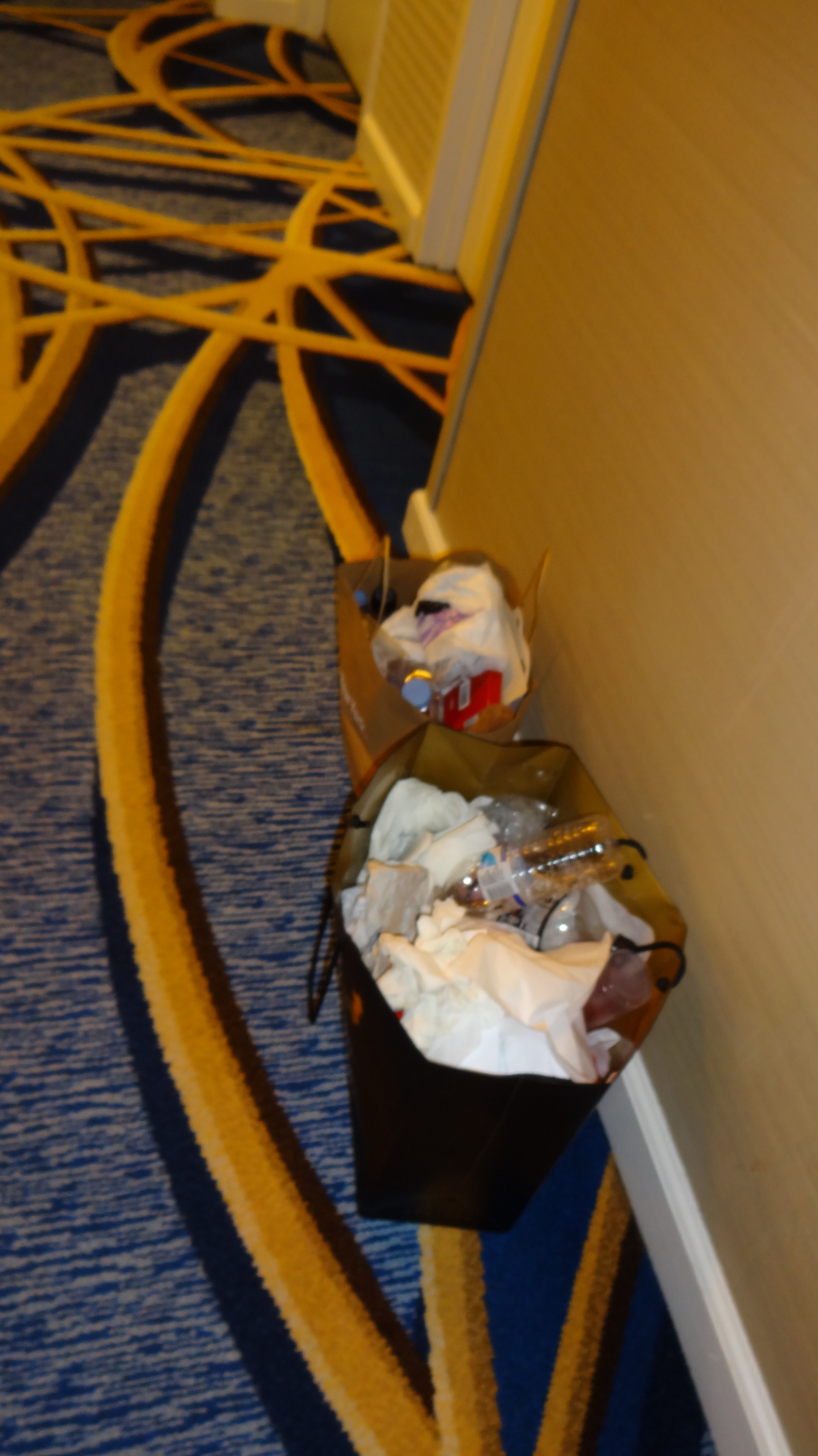 Unsere Tagesabfälle waren vor der Türe parkiert. Was will uns die Putzfrau damit sagen? Vielleicht: „Schaut her, hier wohnen Konsumschweinchen“ oder „Pha, schaut euch die billigen Labels an“ oder vielleicht „Den Abfall müssen wir euch extra verrechnen, da es die zulässige und im Preis enthaltene Menge einen Containers übersteigt“? Man weiss es nicht. Jedenfalls bleiben diese nun die ganze Nacht vor unserer Türe.