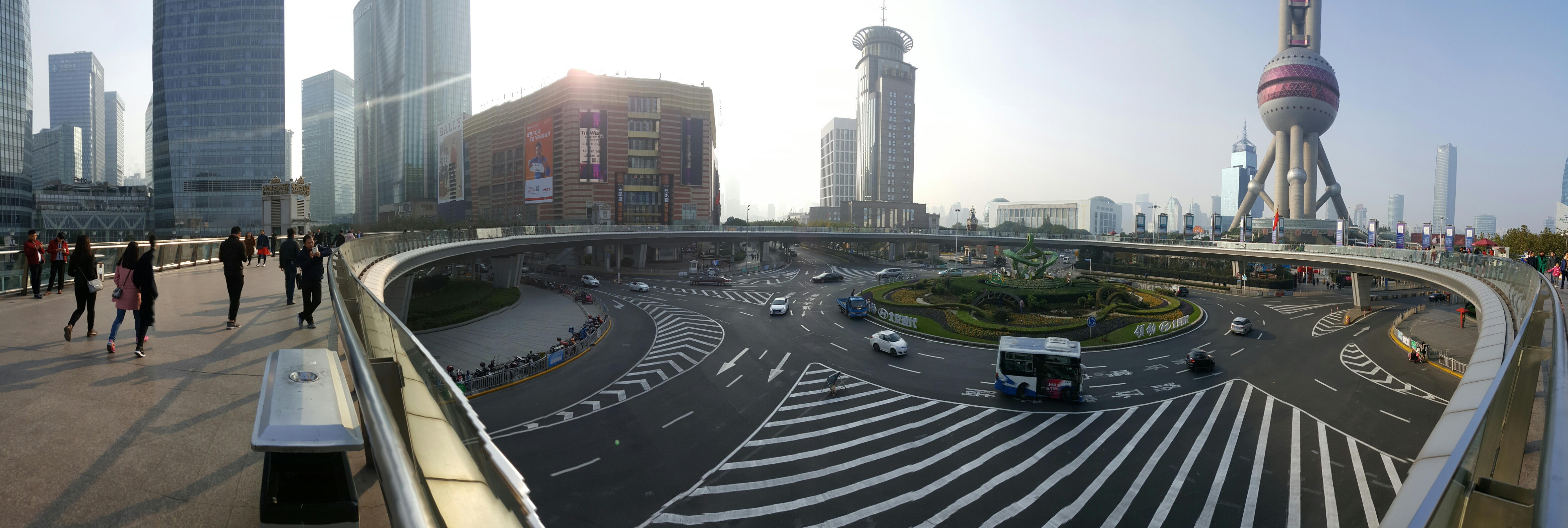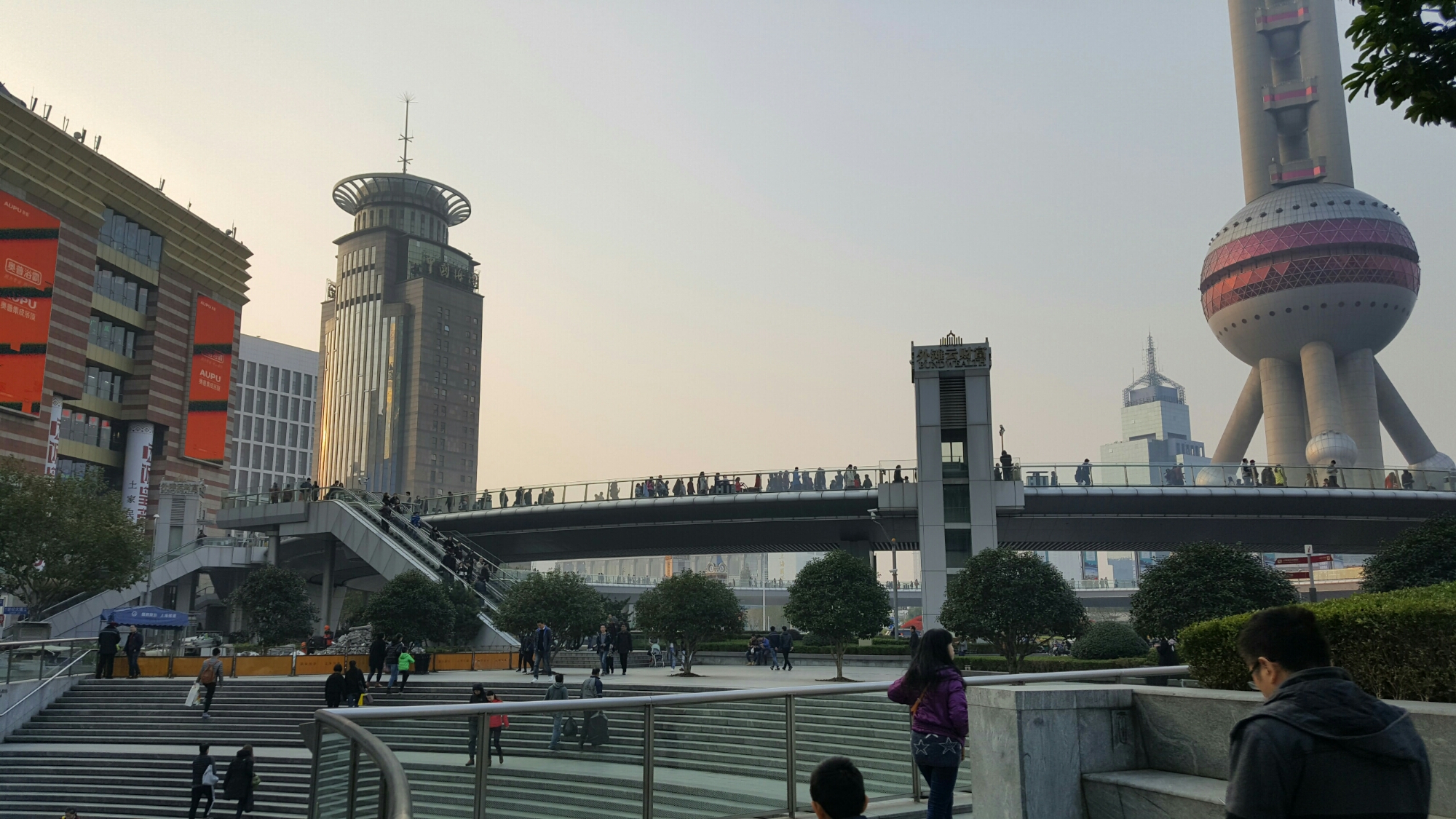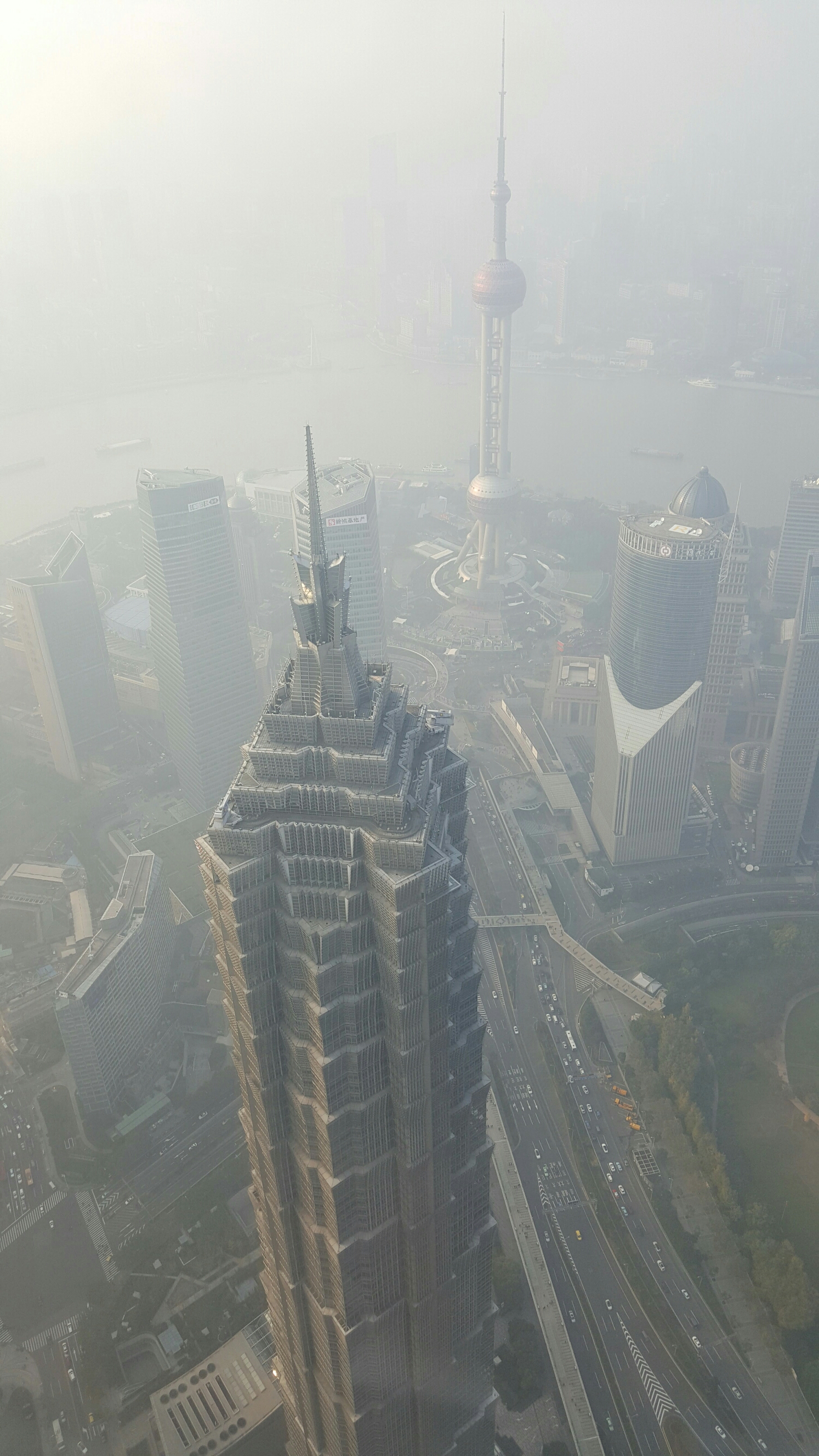 Die Aussicht vom 100. Stock (sozusagen auf der oberen Klinge des Flaschenöffners) wäre gewaltig. Wäre, wenn der Smog nicht wäre. So sieht man halt ein bisschen weiter als bis zum Fluss, auf den Stadtteil Huangpu:
