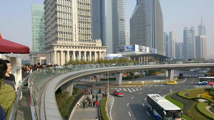 Das Wetter war (ist) herrlich und angenehm warm, so konnten wir Cabrio fahren. Die Tour führte ums vorbei an den ‚Bund‘, DER Uferpromenade von Shanghai, auch für die Einheimischen.