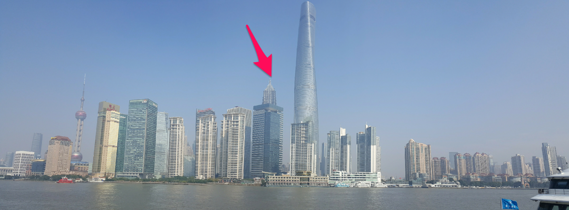Da sticht einem natürlich die Skyline auf der anderen Seite des Flusses im Stadtteil Pudong, sofort ins Auge. Fühle mich gerade ein bisschen heimisch wie in NY. Das ‚wahnsinnige‘ daran ist, dass noch vor 11 Jahren ausser dem Fernsehturm (links, der Turm mit der runden Kugel) und zwei weiteren Hochhäusern, nichts zu sehen war. Nix, nada! Und bei uns kriegen sie nicht einmal ein Stadion nach 10 Jahren hin. Natürlich wollten wir auch mal die Aussicht von oben ansschauen. So machten wir uns auf den Weg zum Financial Tower. Bis vor kurzem (bis 2013) noch das höchste Gebäude Chinas mit 492 Metern und im oberen Bild nicht zu sehen. Magie? Fake? Nein, nur eine optische Täuschung, es verbirgt sich hinter dem Jin Mao Building (Pfeil). Darum hier noch eine Nahaufnahme mit anderem Blickwinkel: