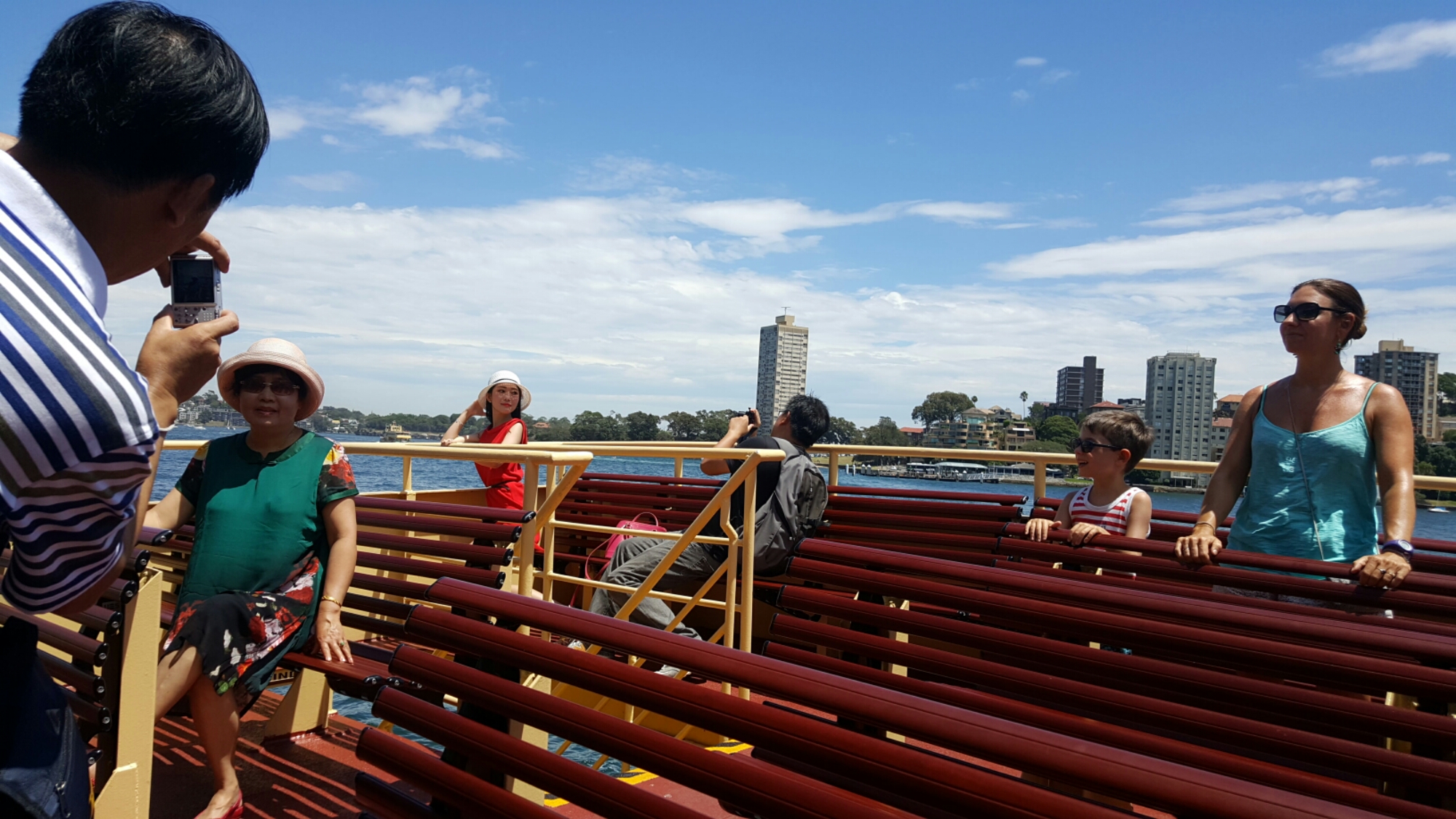 Auf der Rückfahrt mit der Fähre vom Circular Quai zur Darling Harbour wurden wir noch Zeuge der chinesischen Version von ‚Holt mich hier raus, ich will ein Modell sein‘. Vor allem die rote Dame im Hintergrund musste in allen Posen die genauen Anweisungen ihres Fotografen befolgen. Das vordere Pärchen war eher die Kategorie ‚Wie hole ich nur das Beste aus ihr heraus‘? Genau, wenn der Schatten das Gesicht bedeckt! Oder vielleicht hatte er ja gar nicht ’seine‘ Grüne im Sucher…