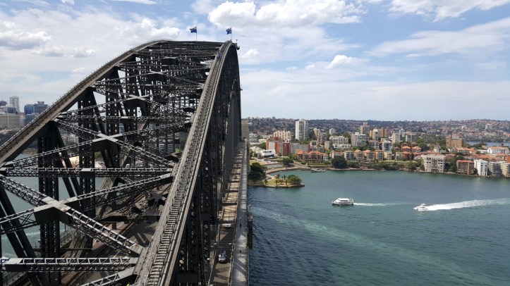 Wir wollten noch die grandiose Aussicht vom Pylon Lookout genieesen. Diesen erklimmt man im südlichen Brückenpfeiler der gigantischen Harbour Brücke. Gigantisch deshalb, weil sie es wegen ihrer Breite mit ihren 8 Fahrspuren, 2 Bahngleisen, einem Radweg sowie einem Fussgängerweg ins Guiness Buch geschafft hat. Der Ausblick ist wirklich genial und unbedingt zu empfehlen.