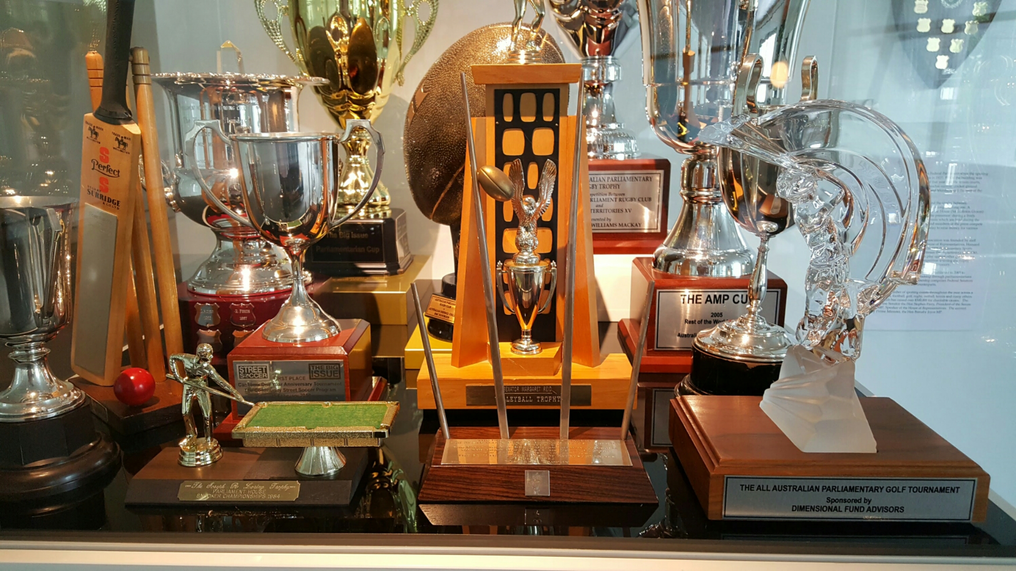 Das Parlament besteht aus 226 Abgeordneten. Und etwa genau so viele Pokale sind im Gebäude ausgestellt. Aber nicht etwa von berühmten australischen Sportgrössen. Nein, die Ausstellung zeigt die Pokale, welche das Parlamentshaus, bzw. deren Abgeordneten gewonnen haben. Sei es im Rugby, beim Golfen, Turnen, Jassen, Mikado, Luft anhalten oder in einer noch zu definierenden Sportart. Ich frage mich nur, wer die Gegner waren.