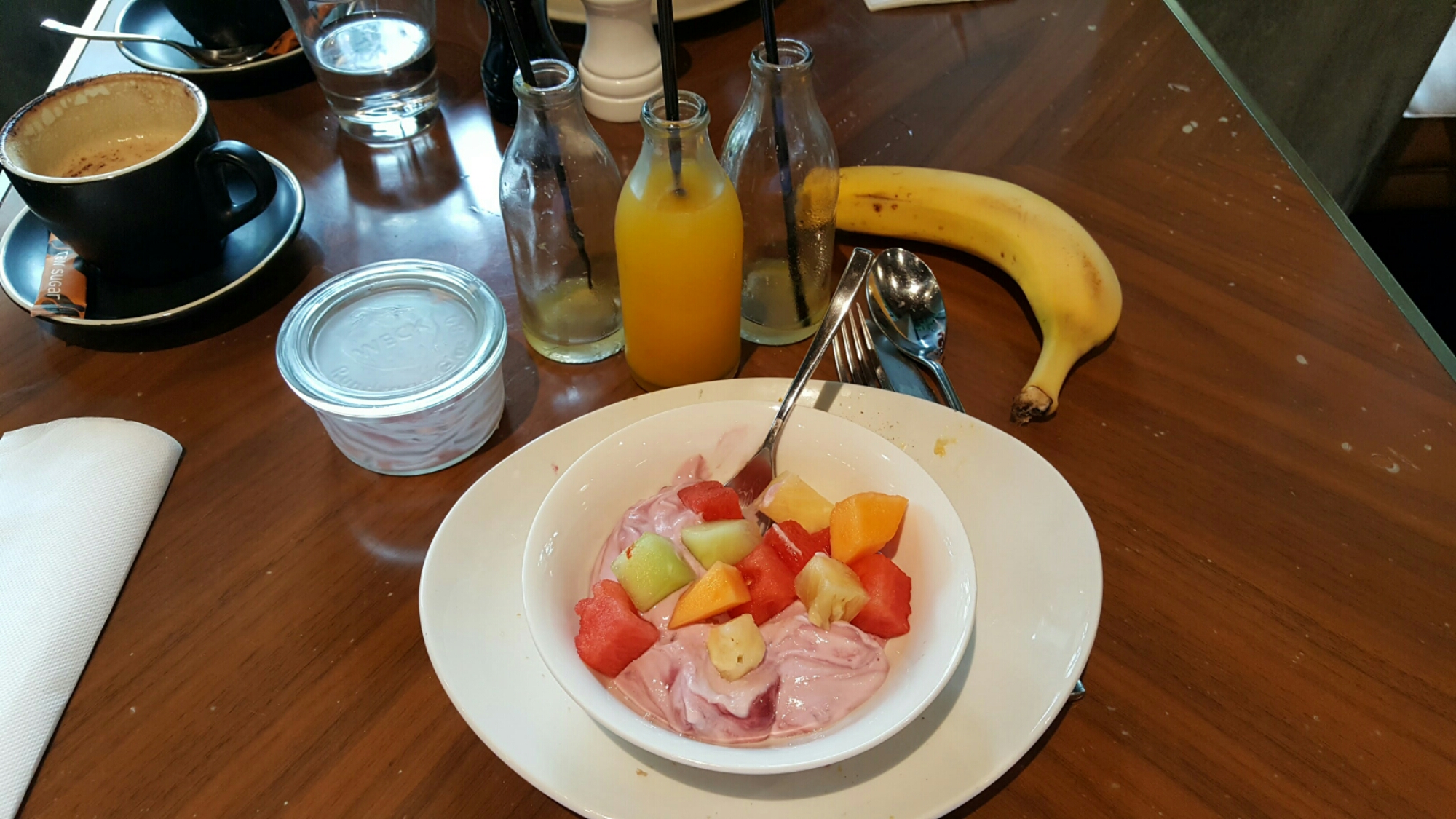Zweiter Tag mit Regenwetter. Ab morgen soll es wieder Hochsommer werden. Hier zuerst mal der Beweis, dass auch ich zwischendurch ein gesundes Frühstück esse. Ok, vor dem gab es Speck mit Ei. Und danach ein Muffin.