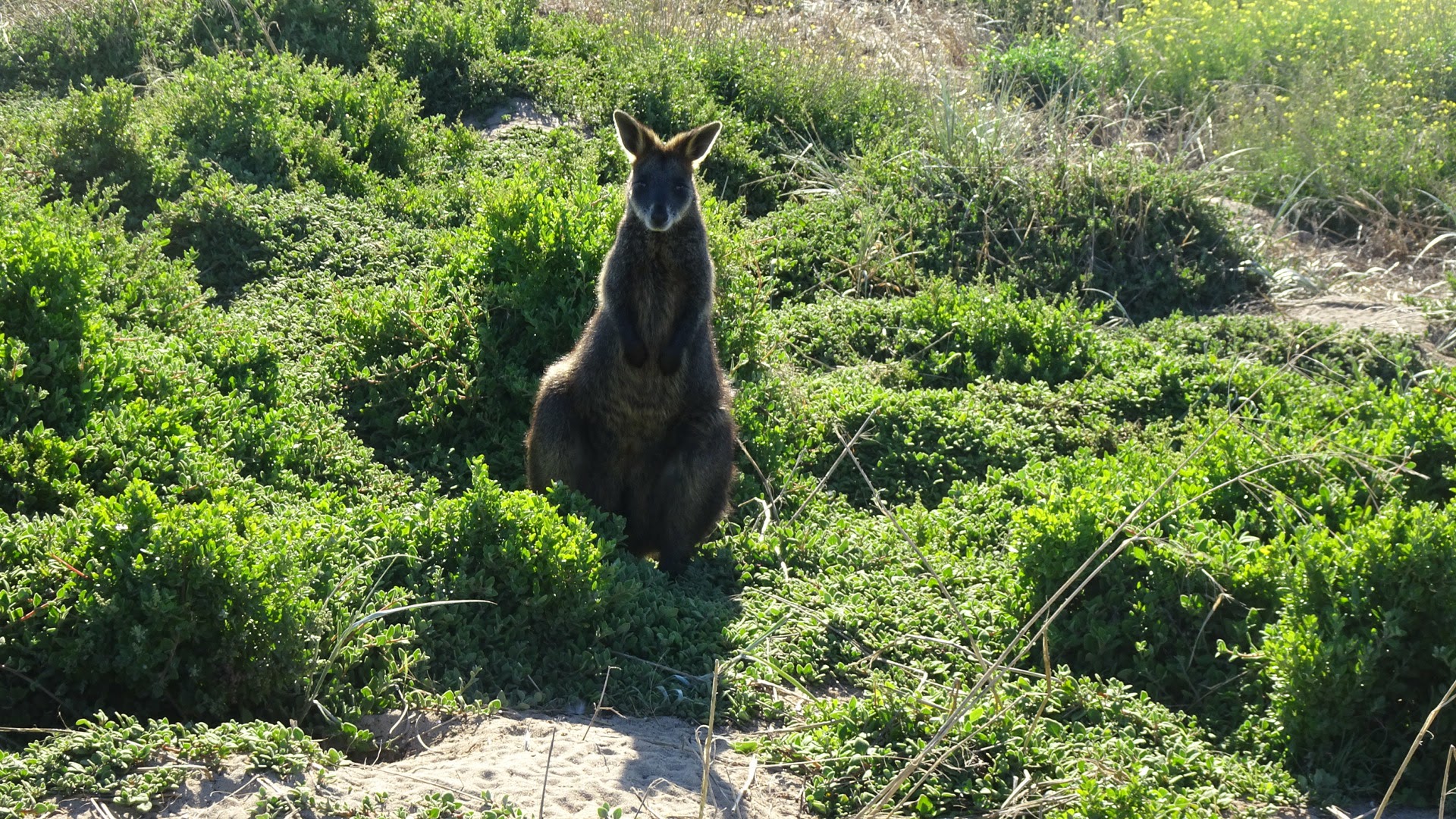 Nach kurzer Ortschaftskunde durch unsere Motelmutter und dem Hinweis, dass die Restaurant so um halb 8 die letzte Bestellung entgegen nehmen, sind wir runter an den Hafen, genauer gesagt zum Inseli Griffitt Island. Dies ist das Naherholungsgebiet der Port Fairyaner und unser Abendspaziergang, etwa 3.5 km lang. Und auch hier hat es wieder einen Leuchtturm, ich habe jetzt dann Leuchtturmittis. Ausserdem ein paar Walabyes. Dies ist die kleine Ausführung der Kängaruhs.