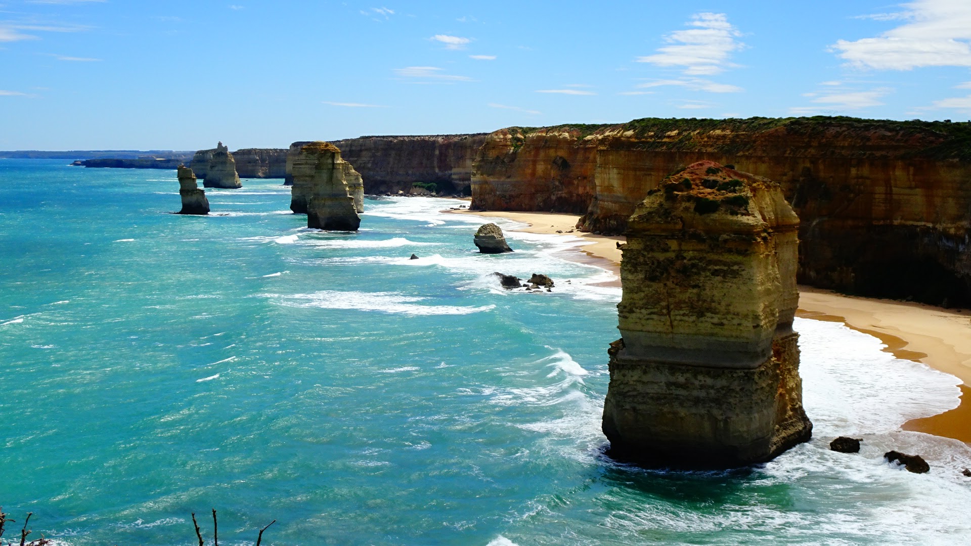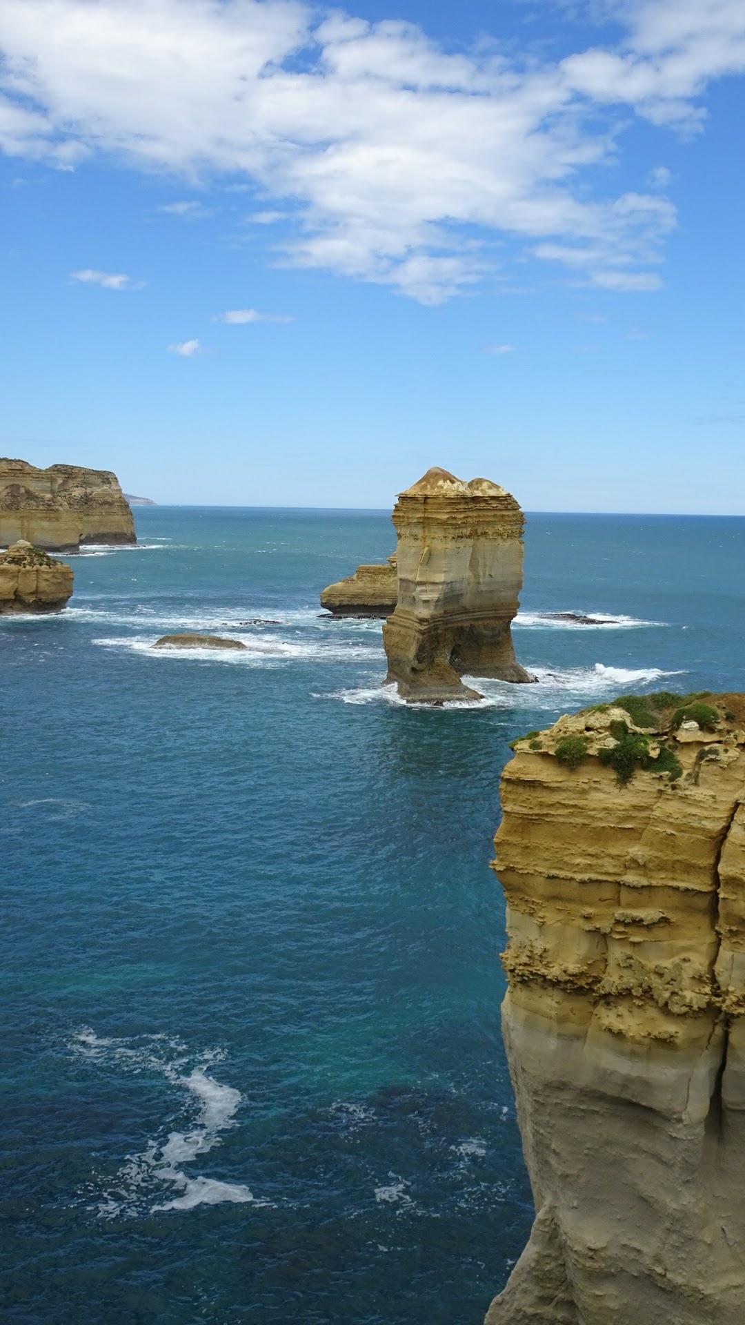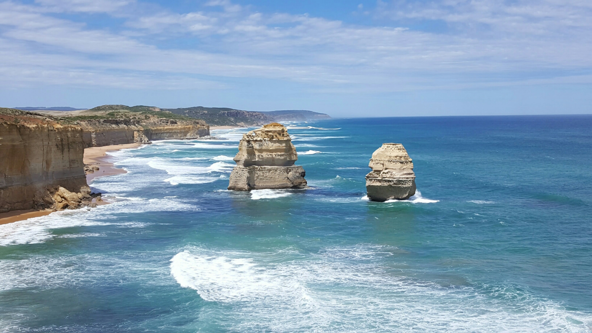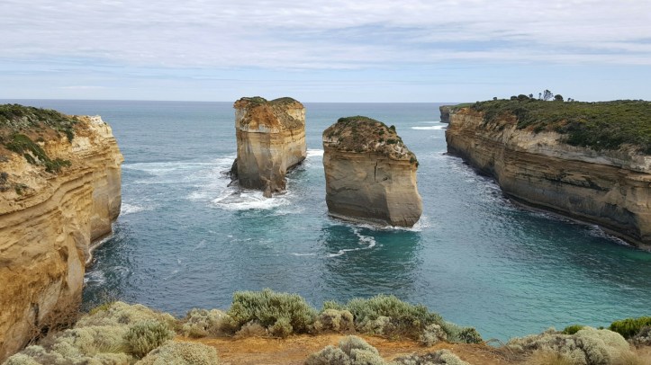 Die Kalktürme der Zwölf Apostel sind geologisch gesehen nur eine Erscheinung von kurzer Dauer. Die Wellen holen sich einen nach dem anderen, gerade 2005 ist ein 50 Meter hoher Apostel zusammengestürzt. Da warens nur noch acht. Allgemein wird Australien immer kleiner. Die Steilküste in diesem Abschnitt weicht jedes Jahr um 2 cm zurück. Wer also Australien noch erleben will, sollte sich beeilen 🙂