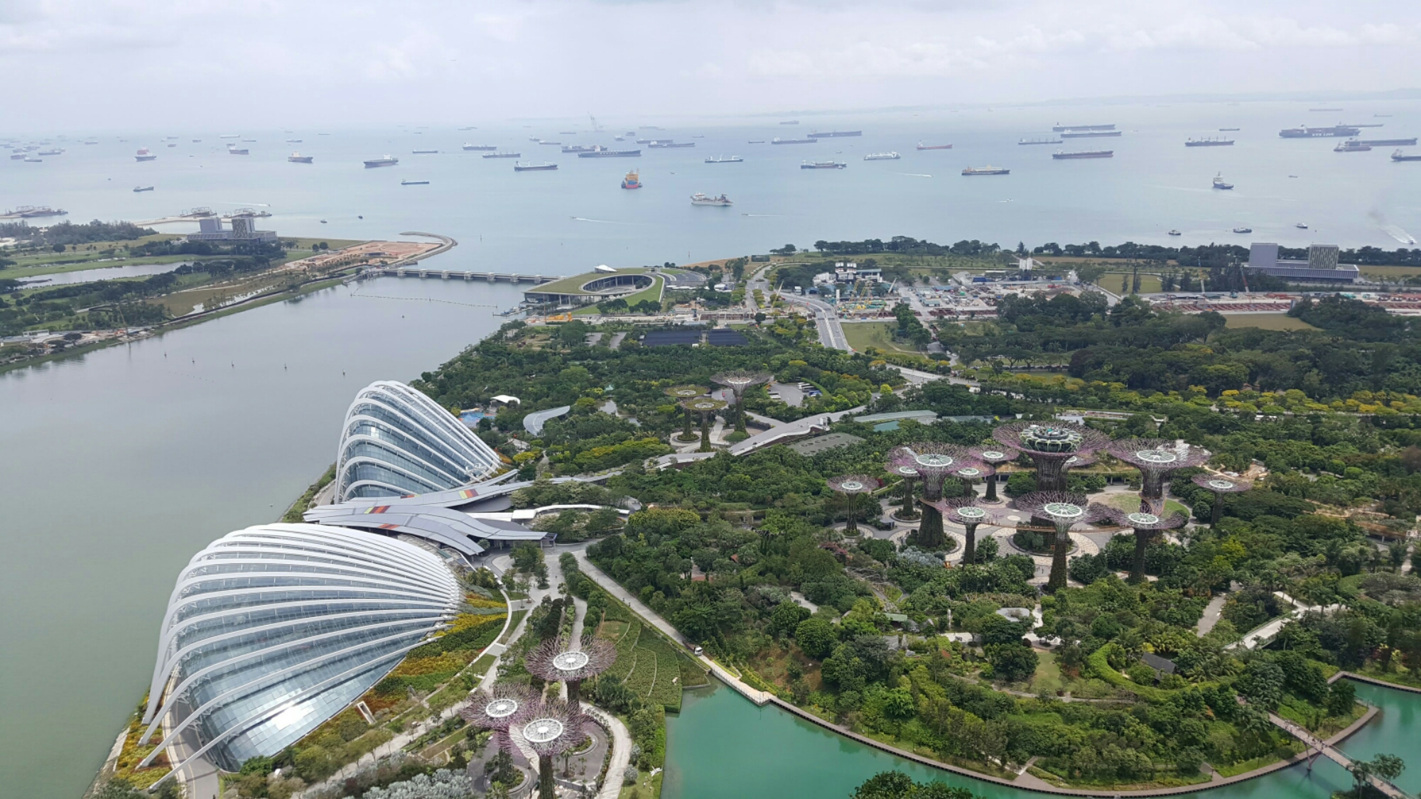 Z.B. blickt man auf den wohl weltgrössten Hafen. Die Schiffe im Hintergrund, welche aussehen wie Mikado Stäbe, sind alle geankert. Und irgendwie verständlich, dass die Hafenbehörde nicht sooooooo einen langen Steg bauen wollte. Im Vordergrund sieht man den botanischien Garten.: