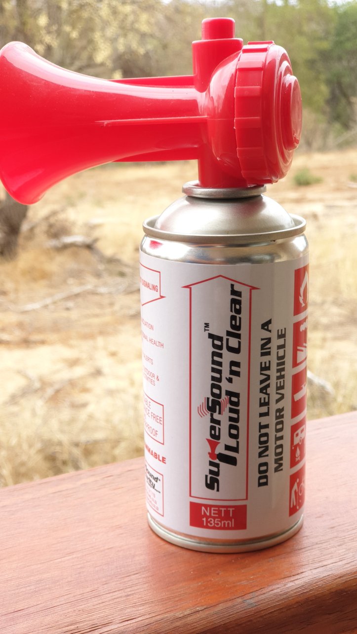 Von unserem Balkon kann man gemütlich Tiere wie Springböcke oder Affen beobachten. Obwohl, bei den Affen glaube ich eher, dass diese uns im Griff haben. Sobald ein bisschen Essen unbeaufsichtigt herumsteht, ist es auch schon in den Mäulern der Affen. Anscheinend können aber nicht nur die Affen ein Problem werden, diese Notfallhupe habe ich im Zimmer entdeckt: