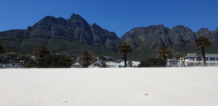 Wir landen in Camps Bay, einem Vorstadtsquartier direkt am Meer. Hier reihen sich die Villen und teuren Hotels wie Sand am Meer. Davon hats auch genug, der Strand ist riesig.