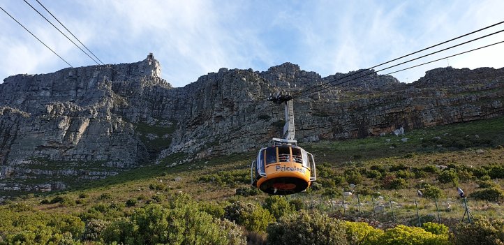 Zurück in Kapstadt wechseln wir wieder von blau auf rot, die rore Linie führt uns wieder zum Tafelberg. Wir kennen nun schon jede Kurve hinauf auswendig, es ist unser dritter Versuch, Kapstadt mal von der Spitze des Tafelbergs aus zu sehen.